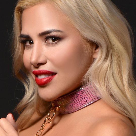 Seduce your partner with this Captive Cobra bondage set! You do not have to wear red and black to be kinky; enjoy this seductive, serpentine set with its pink color and iridescent rainbow shine that will bring out the blushing rose in any submissive! The set comes with two wrist cuffs, two ankle cuffs, a collar and a matching chain leash. Additionally, each of the cuffs connect with short, golden chains that match the chain leash and the golden, buckle closures. Adjust for comfort with the buckles and straps. All metal is nickel-free and the vegan friendly, faux leather is made of polyurethane (PU leather). Spot clean with a soft, damp cloth.