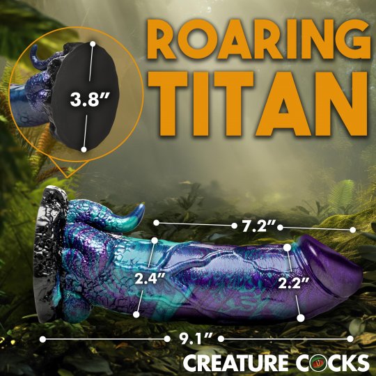 With beautiful, glittering blues, blacks, purples and teals, this Dino dong is about to outshine your other toys! With a massive, mushroom-tip head, you'll enjoy every time you pop it inside! The curved shaft has prominent veins on one side and a smooth ridge on the other. At the base are little dinosaur legs, a curved tail and a small pair of balls. It's as fun to look at as it is to ride! The wide base provides powerful suction so you can go hands-free by placing it on any flat surface to keep it in place. You can also combine it with a compatible strapon harness for pegging play! Made out of premium, phthalate-free silicone, it has a firm core and soft, silky surface. Explore every sci-fi, fantasy, roleplay or cosplay scene you want with this epic adult toy! Use only with water-based lubricants for best results. After play is over, wash the dildo with warm water and soap and use a toy cleaner to spray clean. Wipe dry and store in a cool, dark place out of direct sunlight.