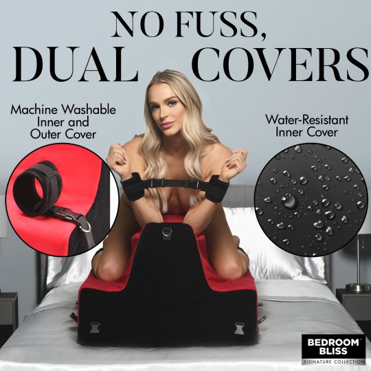 Have your partner climb onto the bench face down, straddling the pillow so their knees are bent and their shins rest against the lower steps of the bench. Caress their body and run your pal down their back until you slowly start to rub their derriere and give them playful slaps. As you see them relax into a comfortable position, their body weight supported by the pillow, take the cuffs and start to place them on their ankles and wrists. Attach them one by one until they are fully restrained. As you play with their backside, enjoy both how relaxed they are and that they cannot break free from the restraints. Release the cuffs from the attachment points and then flip them on their back. The foam has enough give that they can comfortably lay against it, belly up to the sky, without hurting their back. Cuff them again and use toys or hands to tease and pleasure them. Finally, have them sit up, straddling the higher part of the pillow, so they can face you and play with you too! After playing, tuck the pillow away for next time and strip the covers as needed to throw it in the wash!