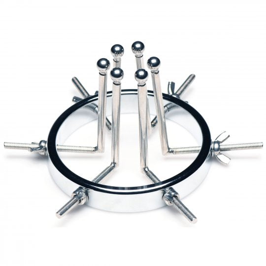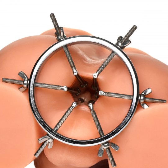 This stainless steel anal explorer is perfect for those into medical play who want to expand and stretch open their backdoor! Made out of strong, durable, non-porous, nickel-free steel, it's compatible with all lubricant types and is nonporous. The Anal Explorer consists of one large ring with a diameter of 4.1 inches and 6 dilators that have smooth rods with small, round, balls on the ends of them. Insert it almost 3 inches deep and spread their hole wide open! The ring is wide enough for you to fit your fist through, as well! Each dilator rod can be adjusted individually using the wingnuts to tighten or loosen the position on the screw. Only the smooth steel will be pressing against the sensitive tissue of the anus while the spiraling screws are outside against the buttocks. To clean after use, rinse with warm water and mild soap or boil it in water. Then spray it with isopropyl alcohol and wipe clean.