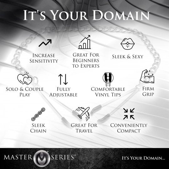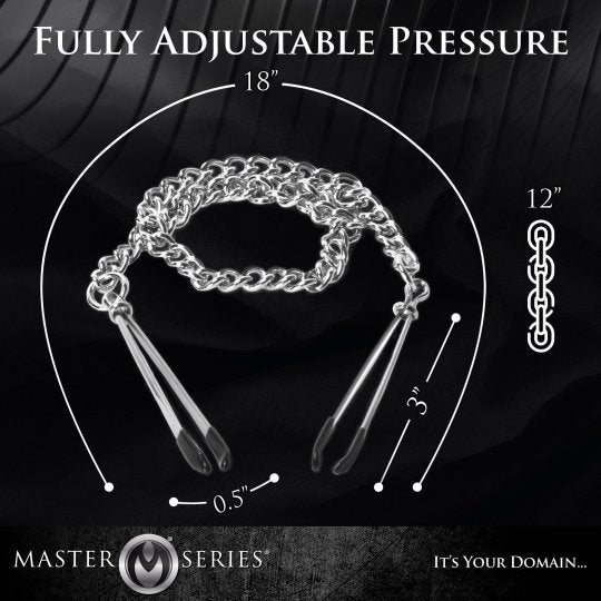These sexy tweezer nipple clamps are designed to exert either light or strong pressure with a simple sliding clamp. Vinyl coated ends attached to a linked chain. Your plaything will love the variation between light and intense pressure, and the chain serves as a visual adornment for a sensual look.