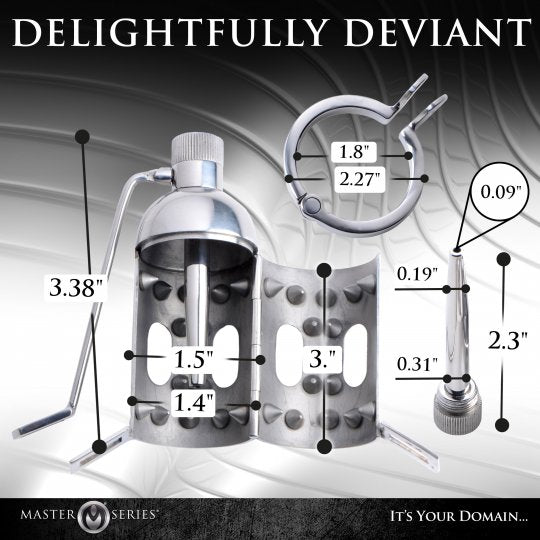This maniacal chastity cage is built for the extreme! Lined with delicious spikes to bite on your dick while you are stretched from the pee-through sound. Squeeze your balls between the small space created from the included ball ring, and lock all three parts together with the included lock and keys and hand them off to your dom for complete submissions.